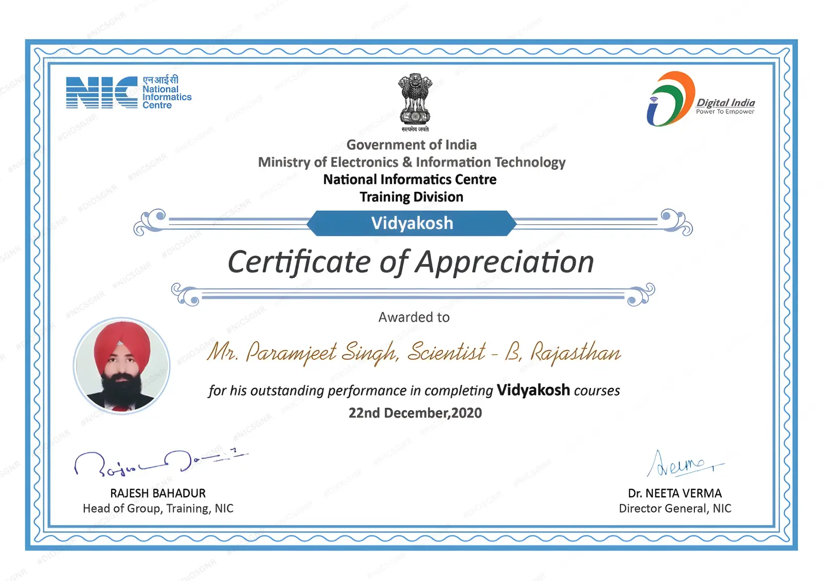 Best performer award 2020 given by the Director General, NIC, Govt. of India for Vidyokosh.