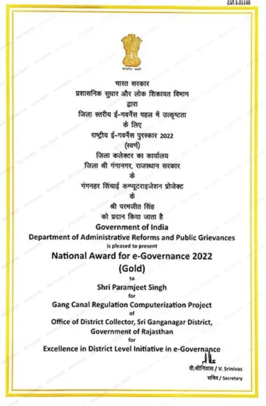 National Award for computerisation of Gang Canal Irrigation system by Dept. of Administrative Reforms & Public Affairs, Govt. of India in 2022