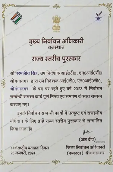 Awarded by the Honorable Member of Parliament-Sri Ganganagar Sh. Nihalchand and Honorable MLA-Sri Ganganagar Sh. Rajkumar Gaur for best working efforts in elections.